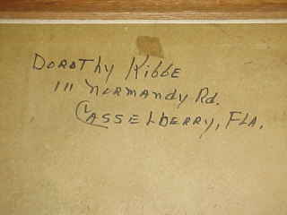 QUERY: I am looking for Dorothy Kibbe--I have an oil painting, painted and signed by her. The picture has the intials DAK on the front and on the back--her name and address. Casselberry , FL. This painting was purchased in Muncie, IN at a flea market in 1986.